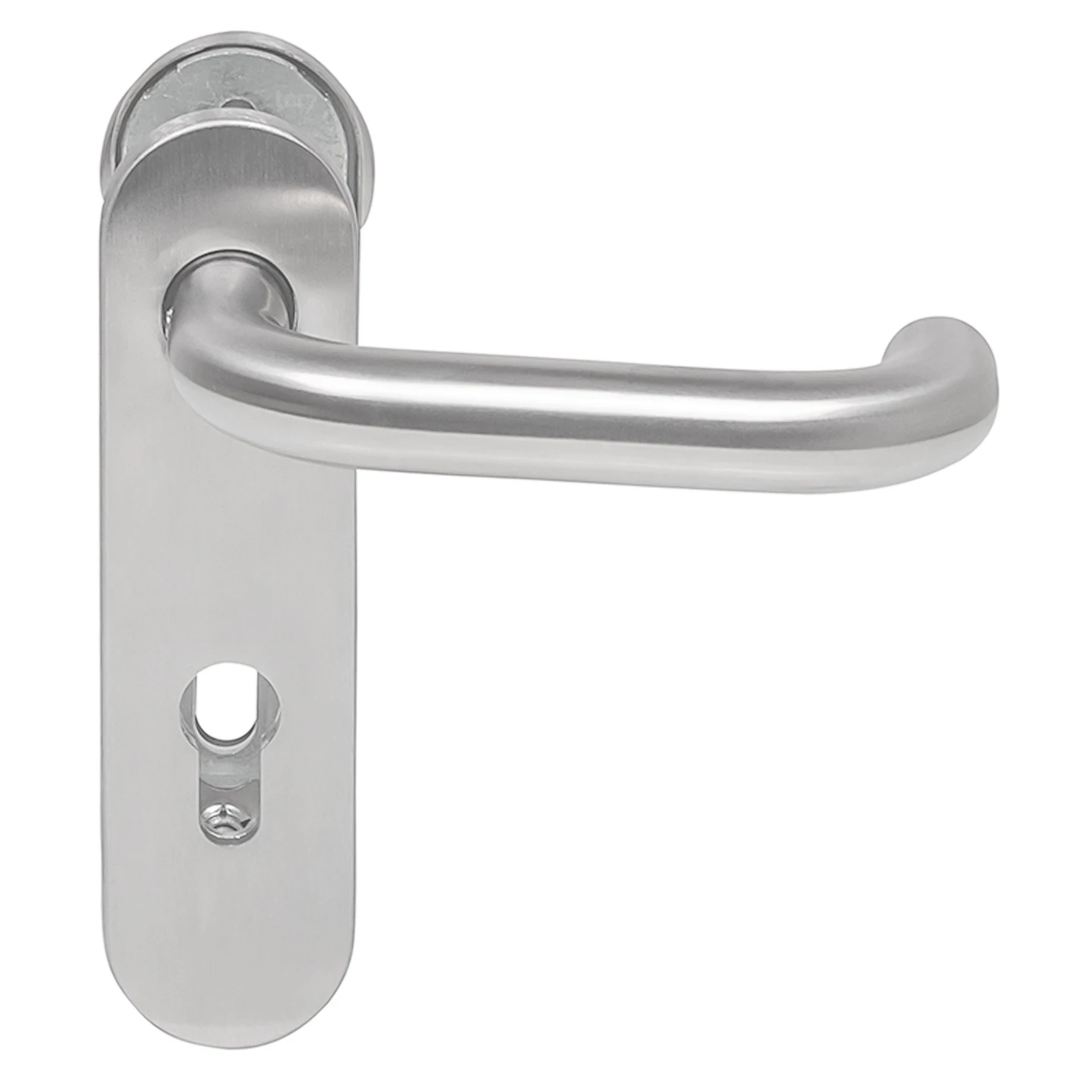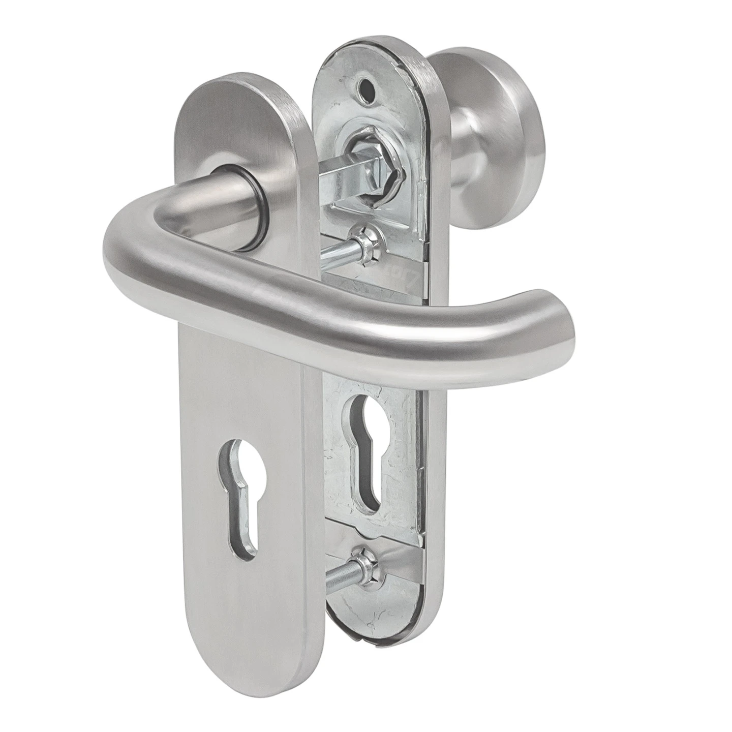 Drücker, Außengriff und Kurzschild sind aus hochwertigem, gebürstetem Edelstahl gefertigt und sorgen auch bei hohem Nutzungsaufkommen für eine lange Lebensdauer. Der Drücker wird in U-Form und der Außengriff in der runden Ausführung Knopf K-130 geliefert. Im Lieferumfang sind die Grundplatten aus Stahl und das Montagezubehör bereits enthalten.