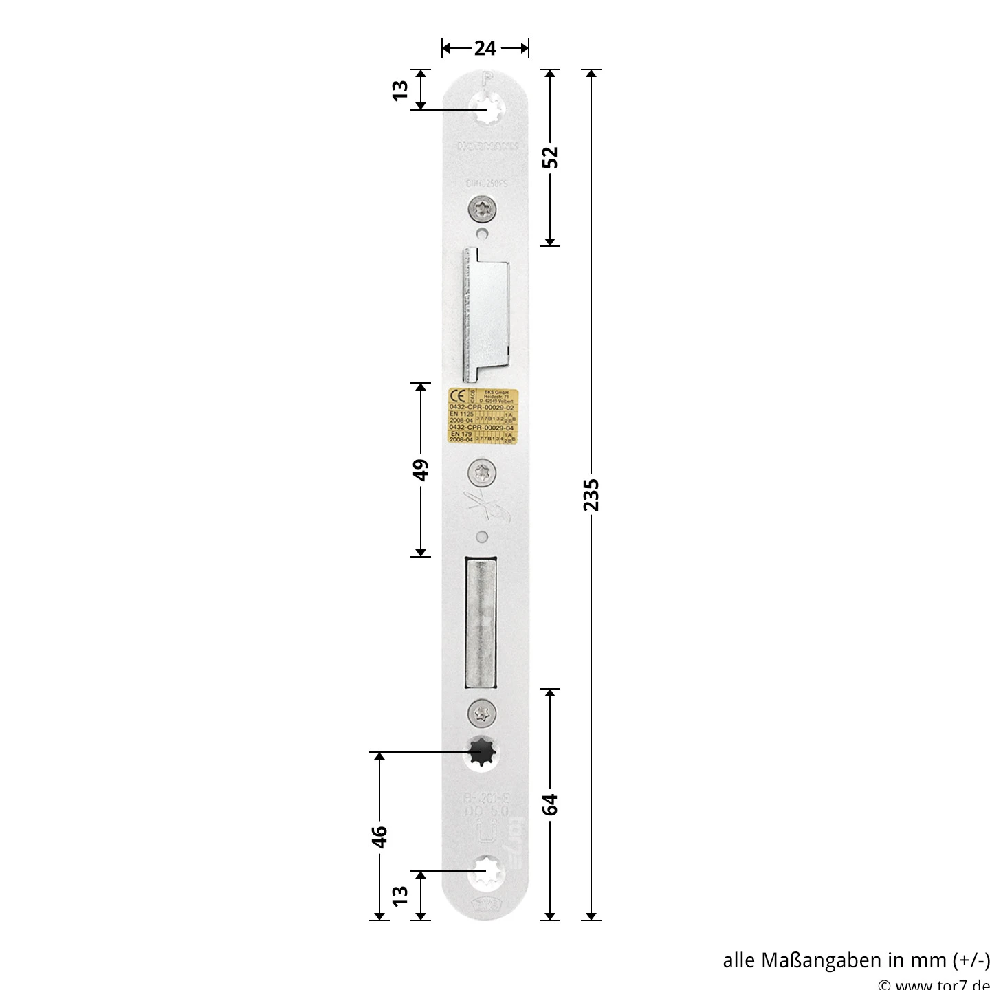 Das Hörmann Panikschloss BKS 1201 mit durchgehender Nuss und PZ-Lochung eignet sich für Hörmann Stahltüren, die nachträglich mit einem Panikschloss ausgestattet werden sollen bzw. als Ersatzteil für bereits als Paniktür fungierende Türen. Das Einsteckschloss mit der Fluchttürfunktion E entspricht hierbei der DIN EN 179 und entspricht somit den Normen, sowie gesetzlichen Regelungen zur Gebrauchstauglichkeit von Fluchttüren. Verwendet werden muss dabei zwingend eine geprüfte und zertifizierte Wechselgarnitur, um die zulassungskonforme Nutzung zu gewährleisten. Einsetzbar ist dieses Panikschloss bei Hörmann Stahltüren oder Fremdfabrikaten mit Türanschlag DIN links und Dornmaß 65 mm.