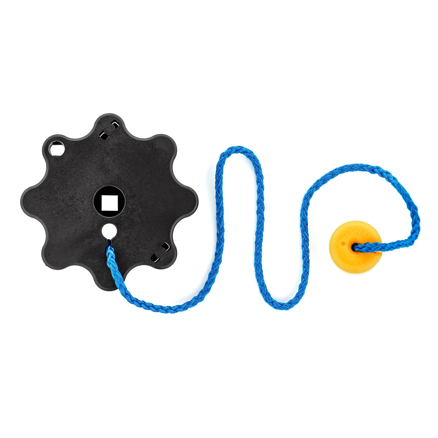 Der formschöne Rundgriff ist aus einem witterungsbeständigen schwarzen Kunststoff gefertigt. Auf der Rückseite des Griffes ist bereits ein Vierkantstab eingesteckt, der von seiner Länge und vom Durchmesser her genau auf die zugehörigen Torschlösser Motiv 902 oder Motiv 905 passt. Zusätzlich wird zum Hörmann Rundgriff Berry Schwingtor DF80/95/98 ein sternförmiger Innengriff, ebenfalls aus Kunststoff mitgeliefert. Dieser passt ebenfalls auf den Vierkantstab und wird anschließend durch die dazugehörige Schraube gesichert. Zudem ist im Set ein Zugseil mit Glocke für besagten Innengriff enthalten.