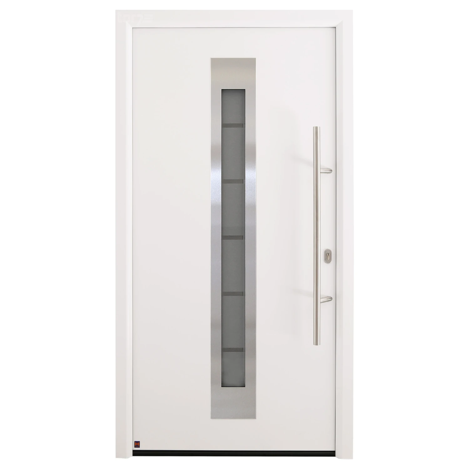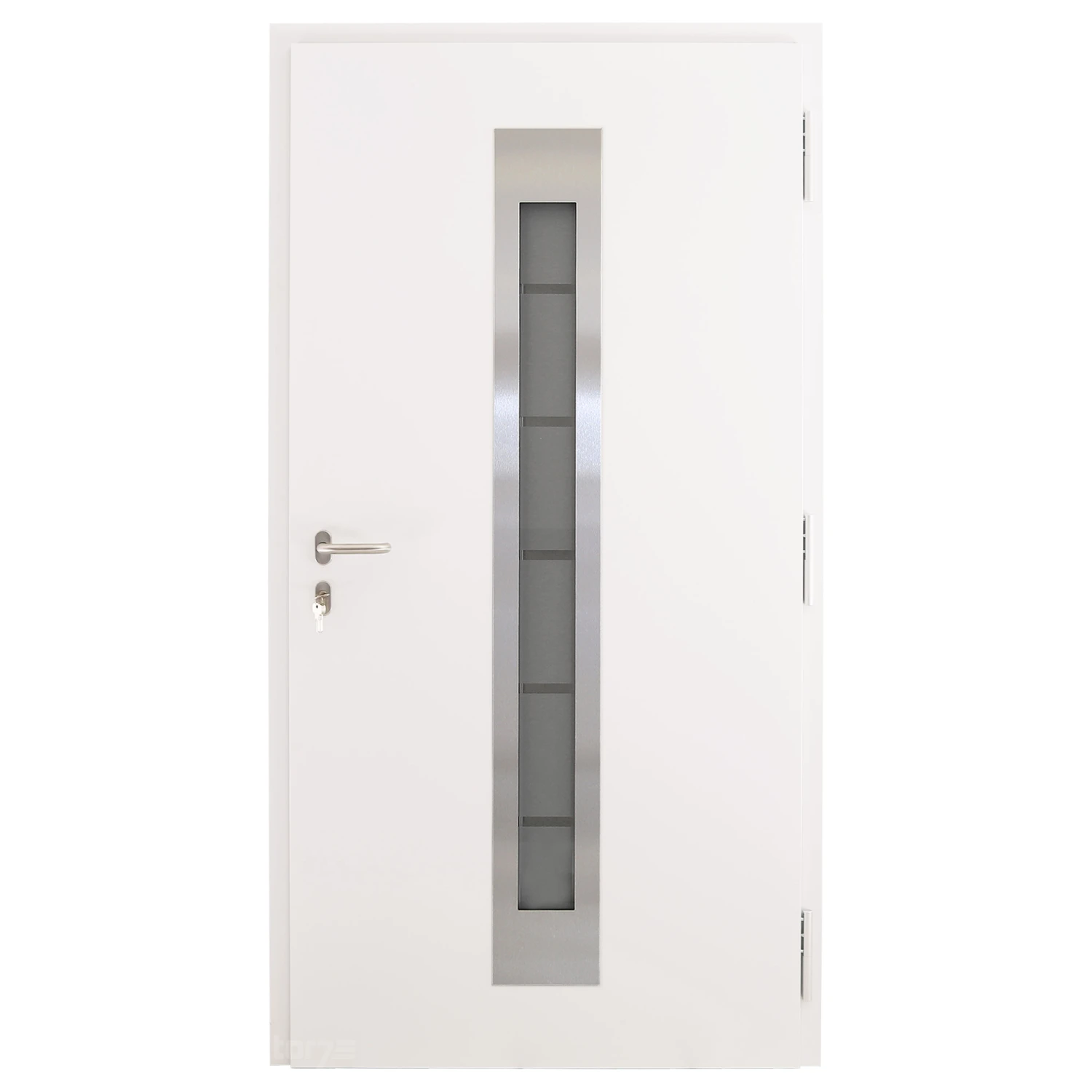 Die zweiteiligen, dreidimensional verstellbaren, stiftgesicherten Rollenbänder sorgen für ein leichtes Öffnen und Schließen der Haustür und optimale Einstellmöglichkeiten. Abdeckkappen in Edelstahl-Optik sorgen für eine gelungene Innenansicht.