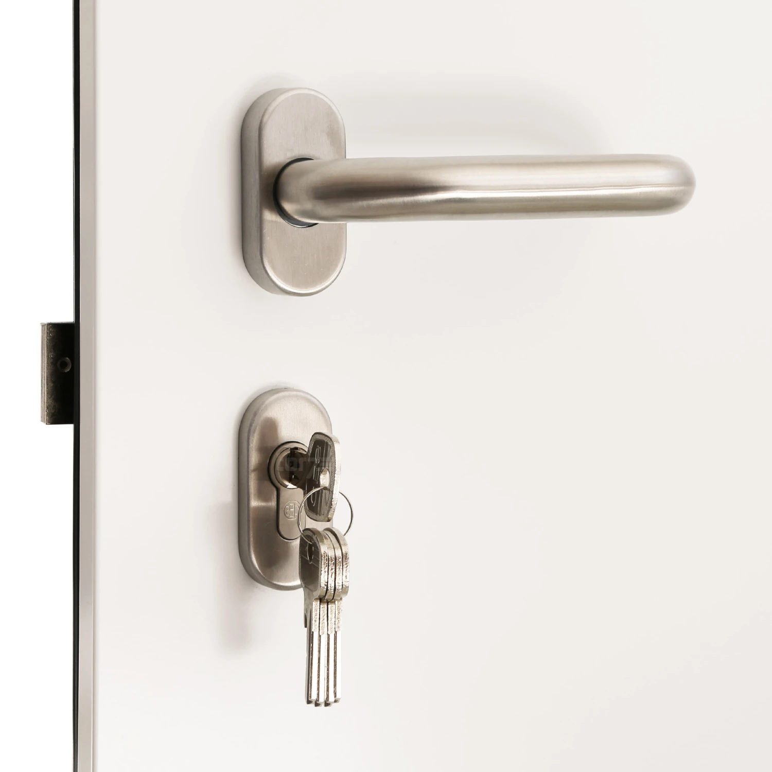 Der hochwertige Innendrücker aus Edelstahl überzeugt mit funktionalem Design und passt hervorragend zur Innenansicht der Haustür.