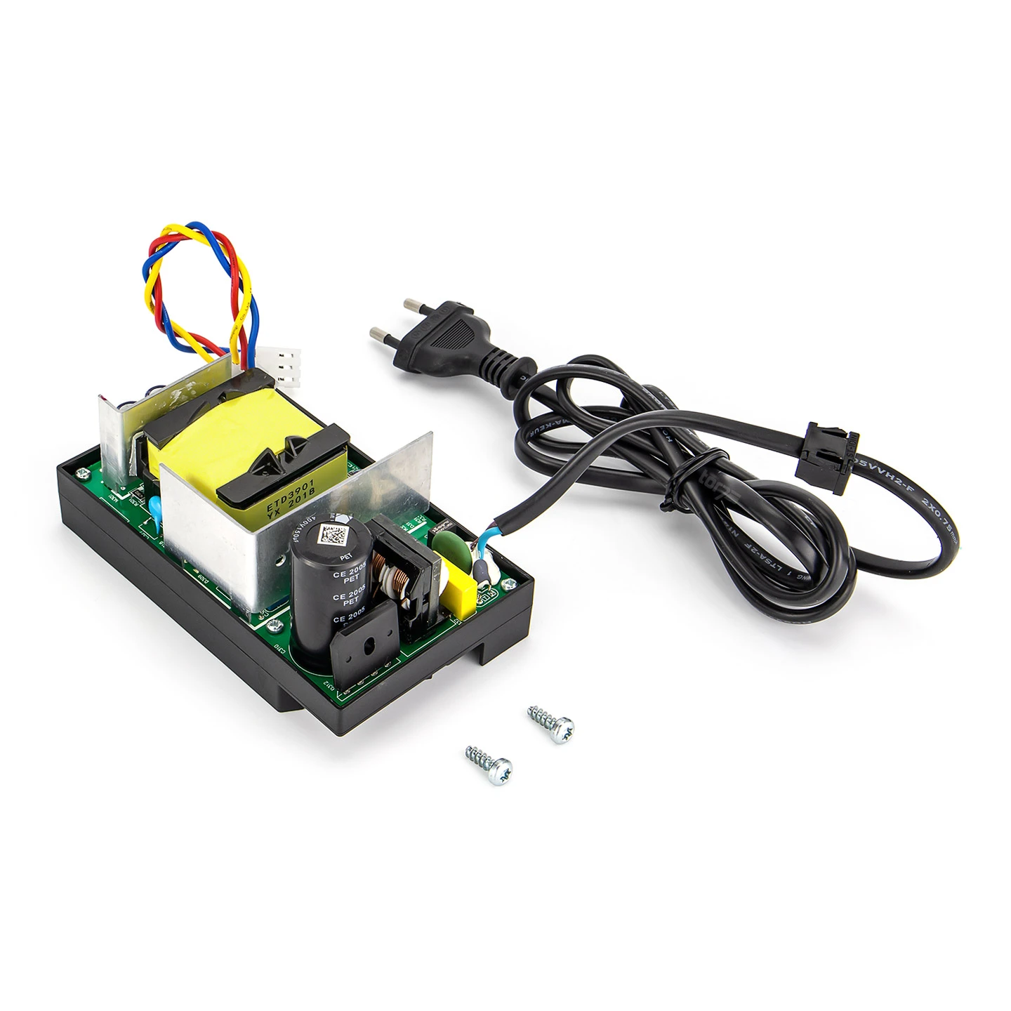 Es handelt sich bei dem Serie-4-Trafo um ein Schaltnetzteil, das einerseits den Antrieb mit Strom versorgt aber anderseits für niedrige Standby-Verbräuche sorgt. Am Eingang des Trafos ist ein Kabel mit Eurostecker angelötet, womit dieser in eine normale Steckdose eingesteckt werden kann. Bitte achten Sie beim Austausch des Hörmann Trafo ProMatic Serie 4 zwingend darauf, dass dieser Netzstecker herausgezogen ist. Zudem befindet sich am Ausgang des Trafos ein dreipoliger Stecker, der in den entsprechenden Steckplatz auf der Steuerplatine passt.